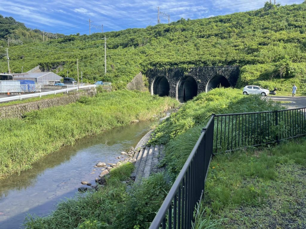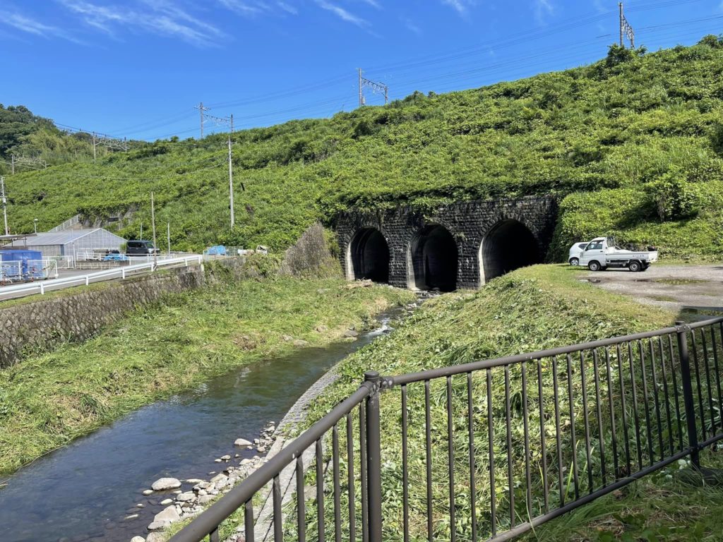 この川隧道は函南町の産業遺産となっていて、当時、丹那トンネル工事でトンネル内から掘り出した土砂や岩石はトンネルから三島駅までの谷を埋めて、鉄道を敷設する土台に活用されました。 大竹の谷を流れていた来光川の流れを止めないように3つのトンネルを貫通させています。