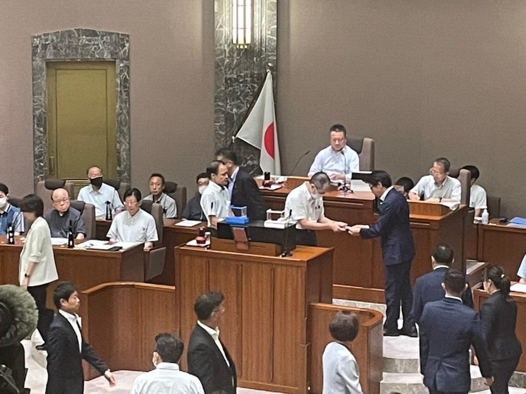 不信任決議案は全議員の2/3以上の出席と、出席議員の3/4以上の賛成が必要ですが、採決の結果、賛成50人(自民改革会議・公明党・無所属全員)、反対18人(ふじのくに県民クラブ全員)で否決となりました。