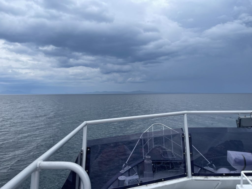 北方領土の国後島、知床富士とも呼ばれる羅臼岳を主峰とする知床半島、ふたつの大自然に囲まれた根室海峡に位置する羅臼の海。観光船にて日露中間ラインの手前近まで近づき国後島を洋上視察した。